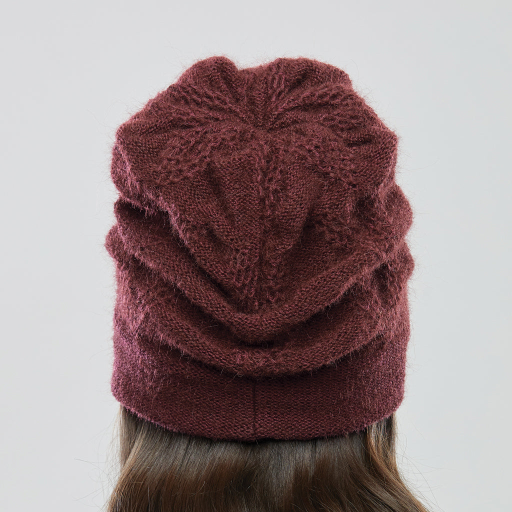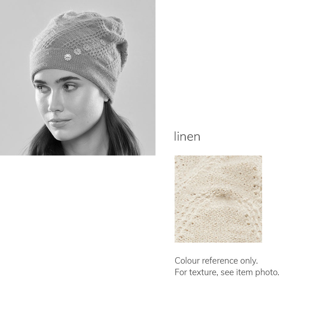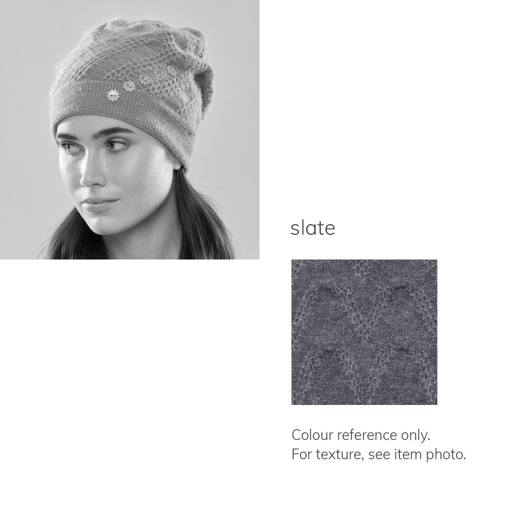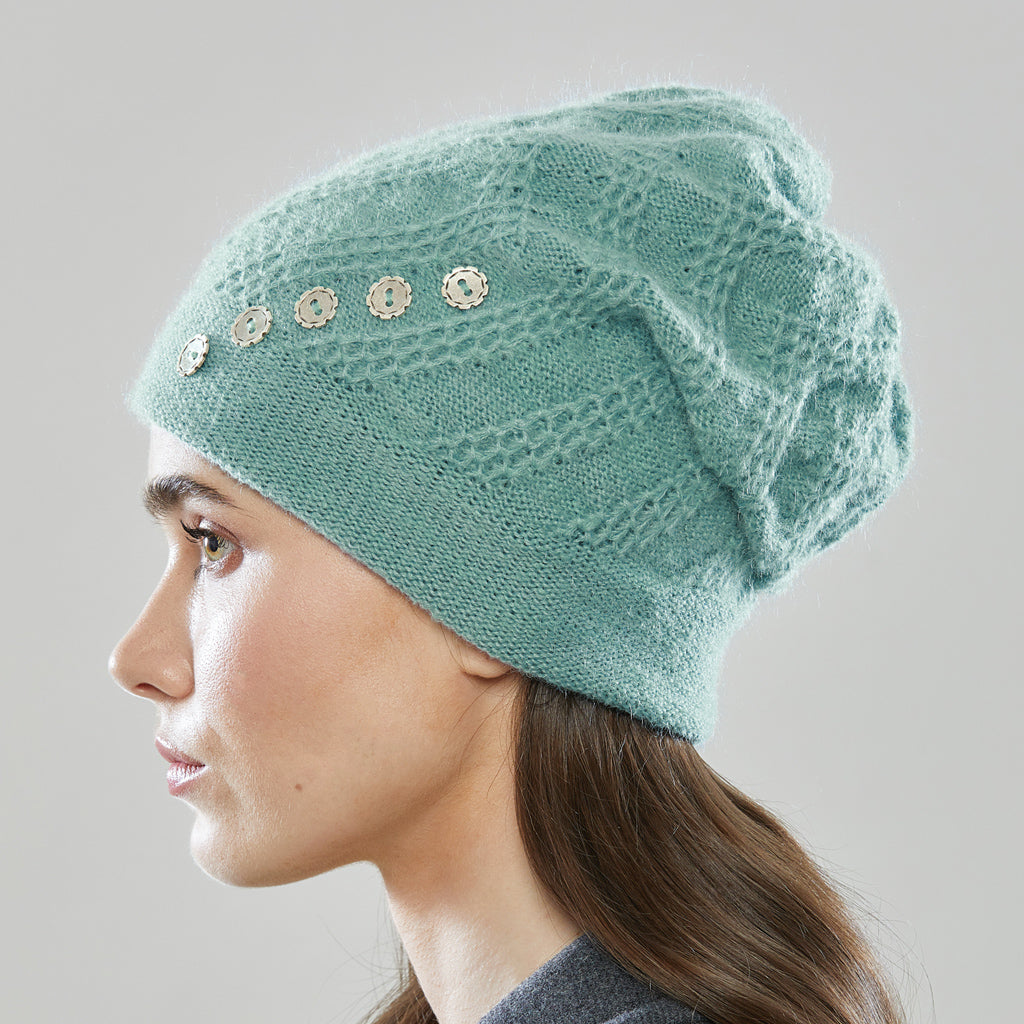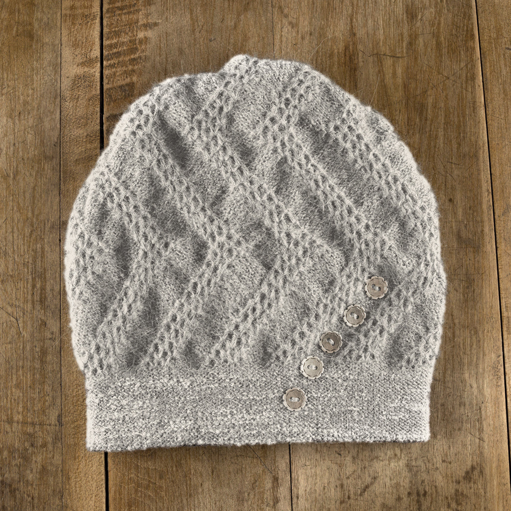 The Mercury Five features lively zigs and zags which subtly wrap around the head, creating a textural backdrop. The dynamic angles of this stitch pattern are then paralleled by a chic row of leather buttons which not only integrate visually, but provide a dash of sheen. Fully lined for winter with 100% merino, and handmade at our studio.