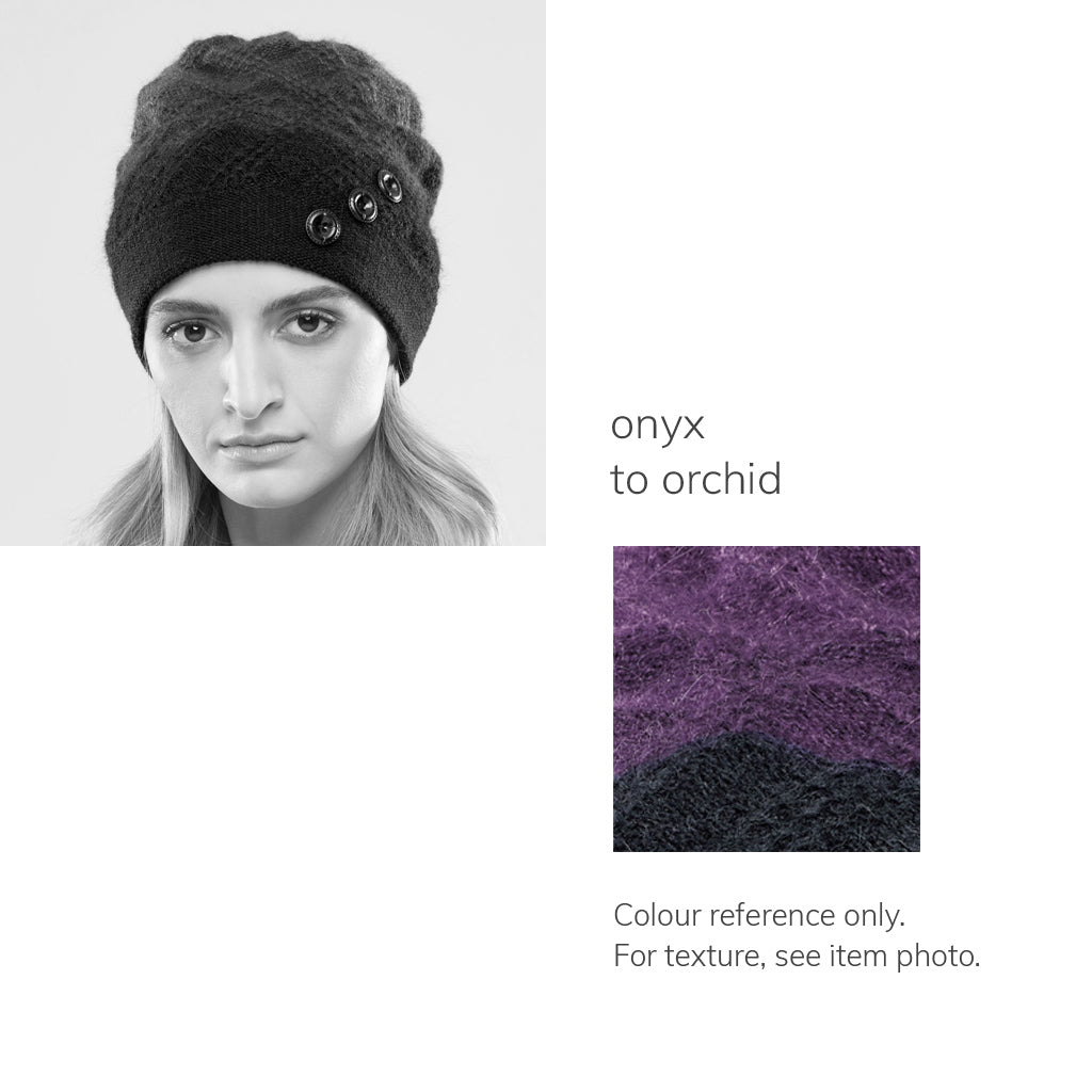 Utilizing an ombré pattern, this winter tam's colours delicately shift from one complimentary hue to the next. The Slopeside sparkles with mohair on the outside, and is fully lined with super warm, but breathable, 100% merino wool. Featuring three natural shell buttons, and a back pleat that maintains the hat's shape, no matter the weather. Handcrafted in Canada.