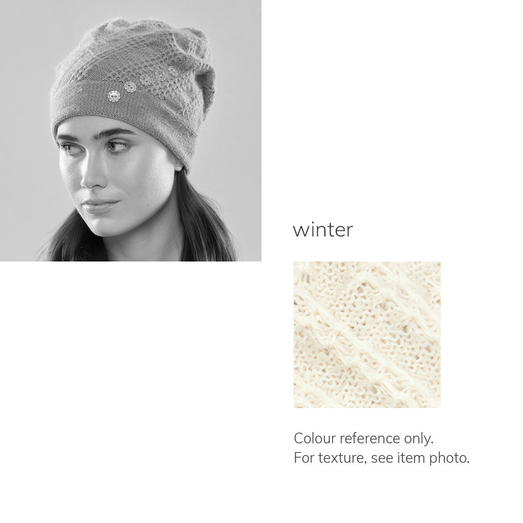 The Tara Two-Tone possesses a sparkling accent that sets it apart from so many others. You can choose to position this detail at the back, or wear it jauntily off to the side. Either way, this toque's thoughtful integration of form, function and intricate pleating are sure to have you basking in the spotlight. Fully lined with organic cotton, and handcrafted in Canada.