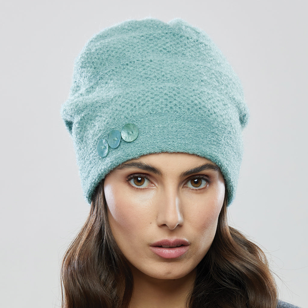 Five leather coat buttons add a dash of lustre to this fully lined winter toque. Knit with a premium merino/alpaca blend, the Raven Five features a pintuck stitch pattern, and is pleated at the back to maintain the hat's unique shape. Available in goes with everything Raven, and handmade at our studio.