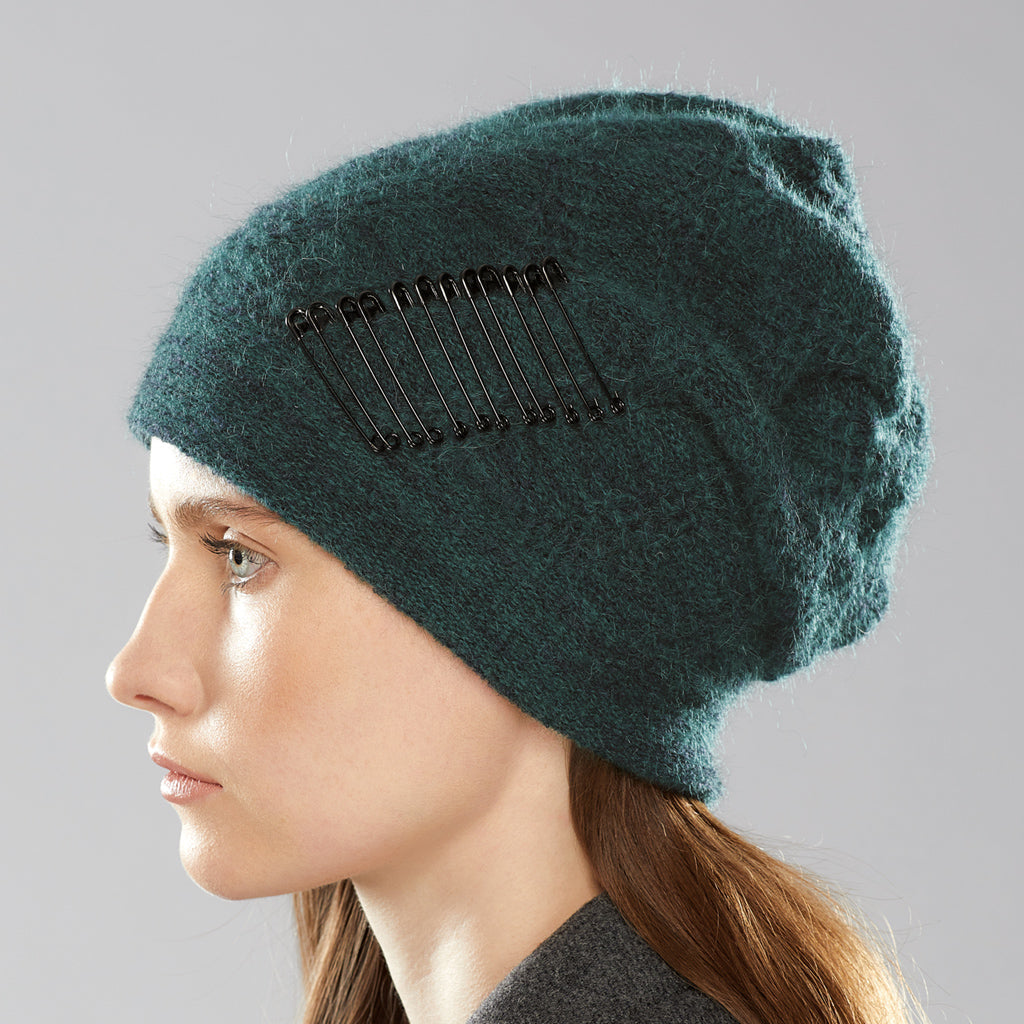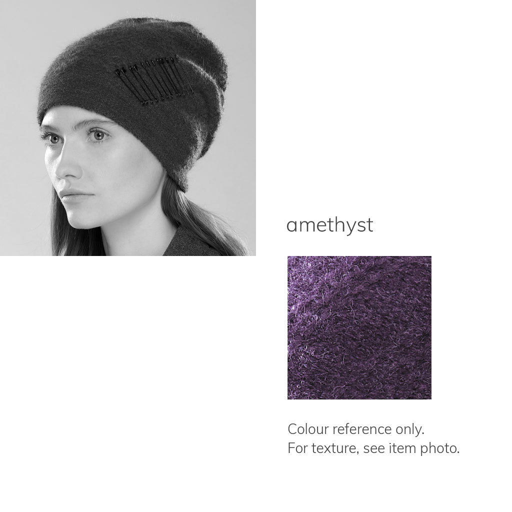 With its dramatic silhouette, the Solstice Punk is a true statement piece. It's split at the back (great for ponytails, and keeping ears toasty), and is fully lined with 100% merino. Accented with eight black metal safety pins for a striking tone-on-tone look. Handcrafted at our studio in Collingwood, ON